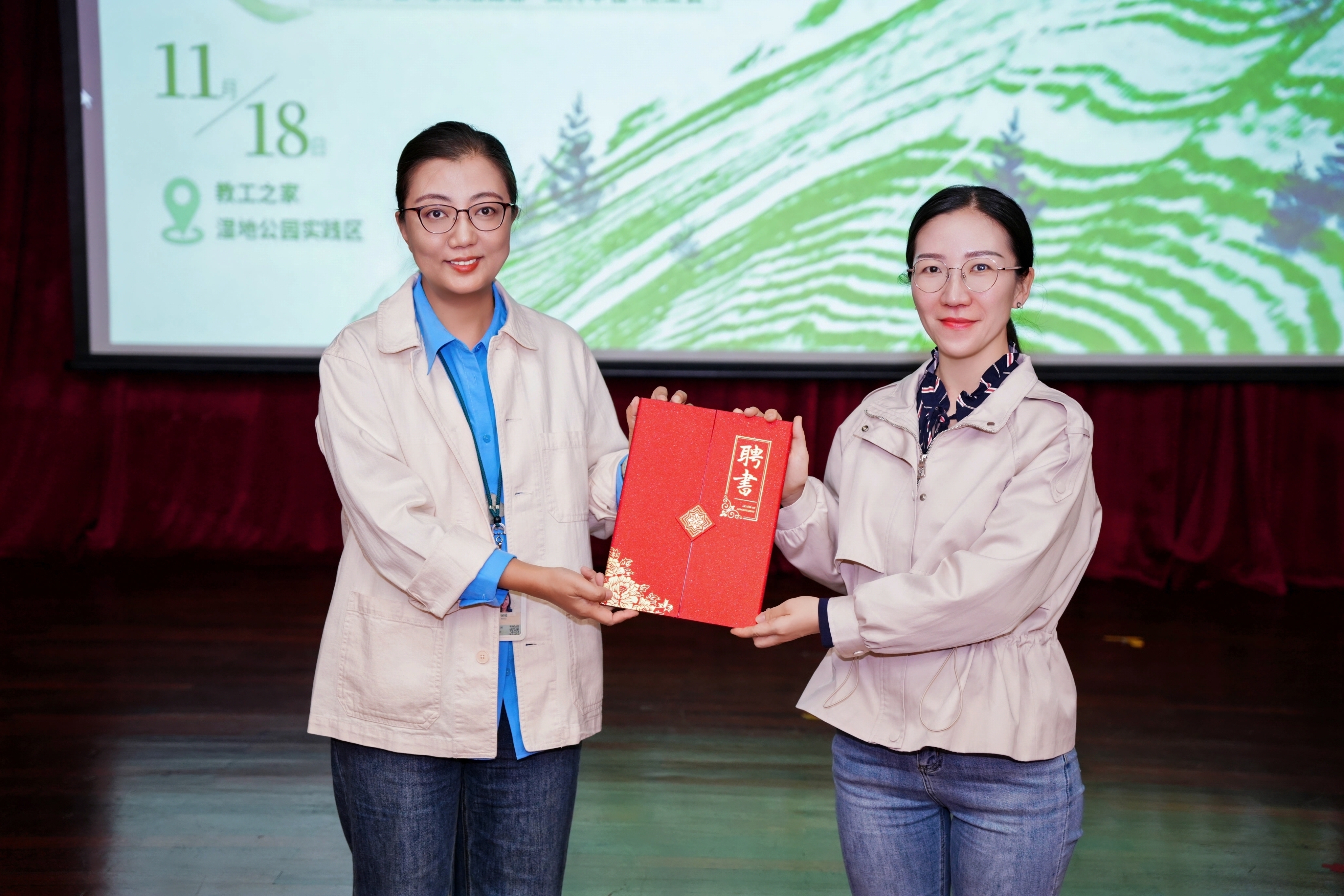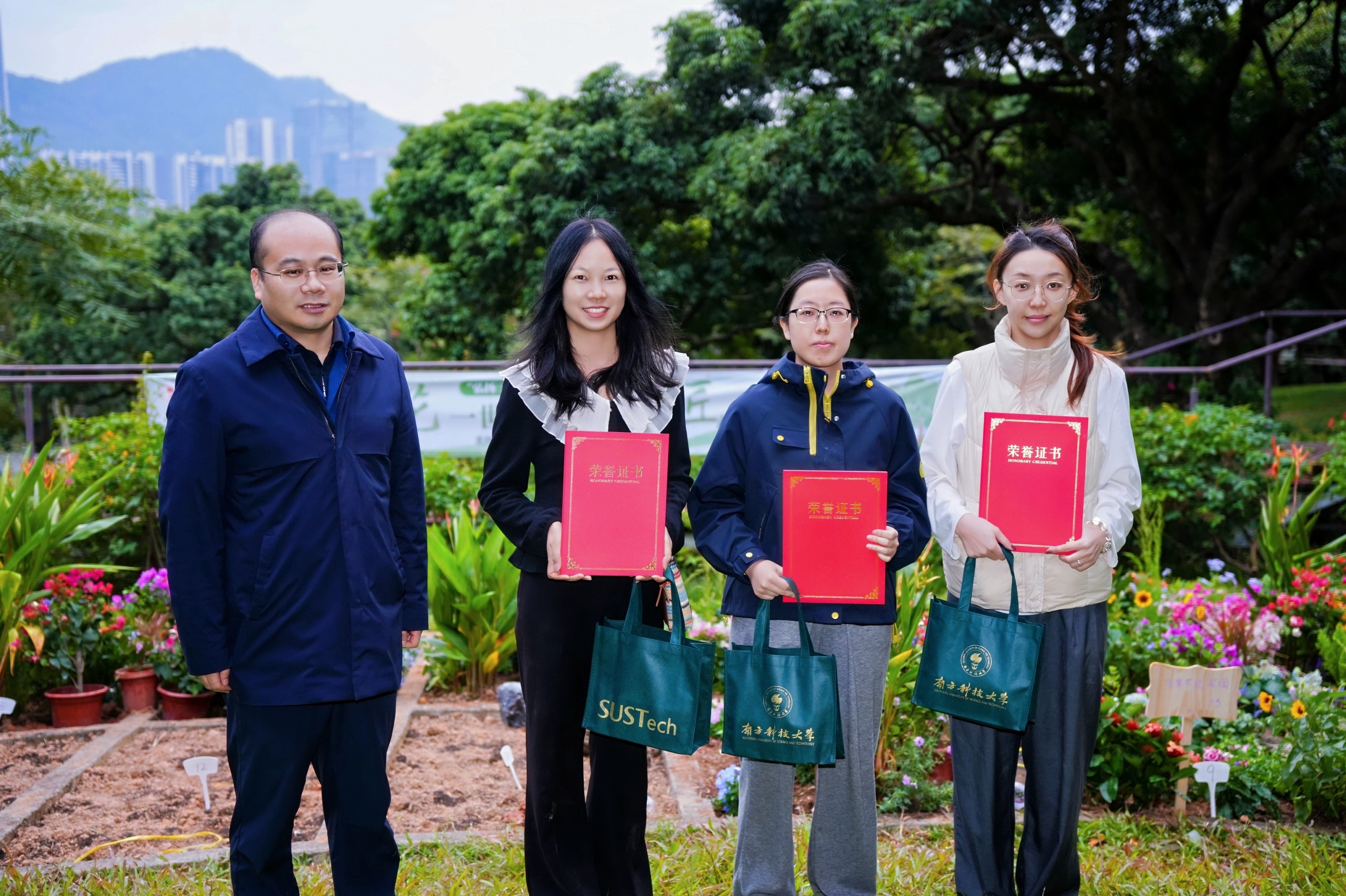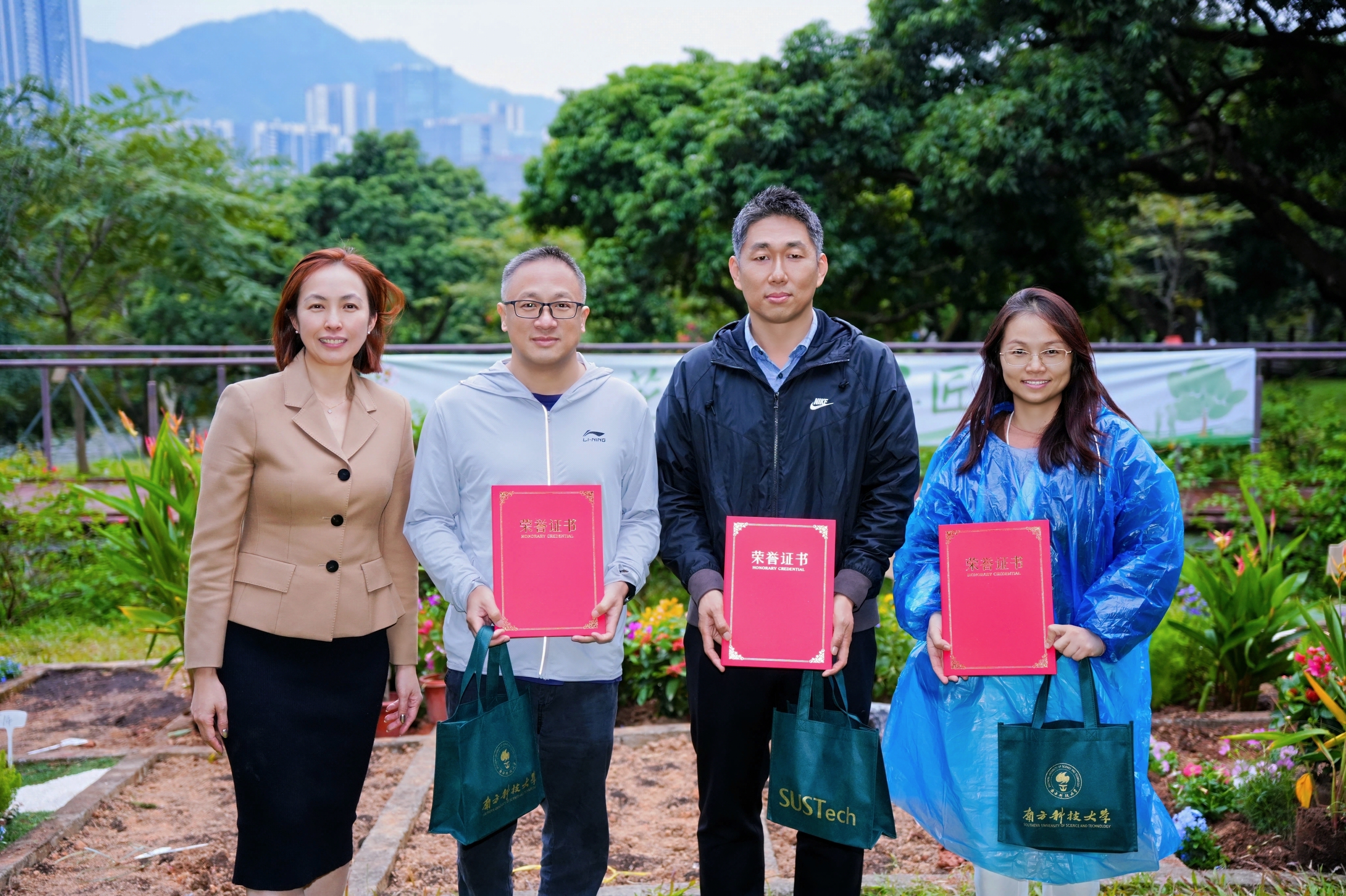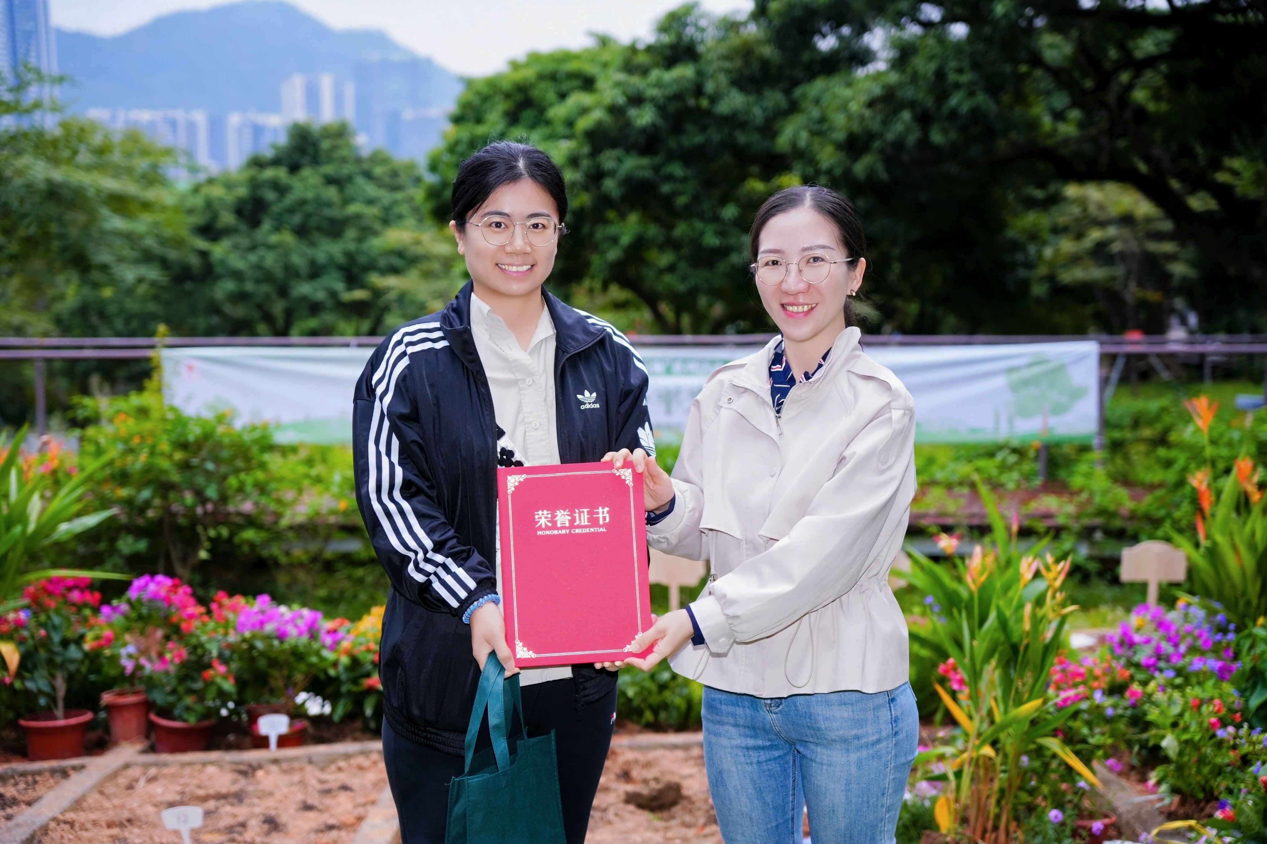 徐璐书记为韩婧老师颁发南方科技大学总务后勤部“后勤育人导师”聘书。这意味着我们将建立长期联系机制,韩老师将持续通过线上答疑、现场指导等方式,为我们的绿意梦想注入专业力量!